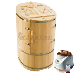 Готовый комплект - это полностью укомплектованный набор с фитобочкой для процедур парения. Овальная модель более просторна и удобна в использовании. Толщина стенок составляет 25 мм. Бочка оборудована откидными створками, дверцей и отверстием для головы. Верхний скос изделия делает положение головы более комфортным и улучшает обзор. Во время парения человек сидит внутри кедровой бочки, а голова находится снаружи. Благодаря этому исключается возможность перегрева. Подлокотники из кедра, встроенные ручки на створках и двери делают эксплуатацию более удобной.